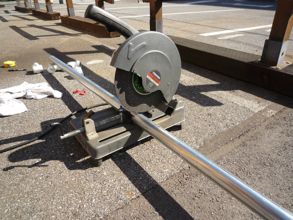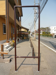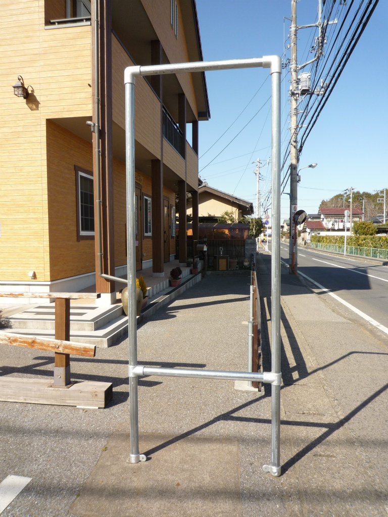 両面ターポリンを利用した自作看板。 足場単管パイプで枠を作ります。 |