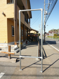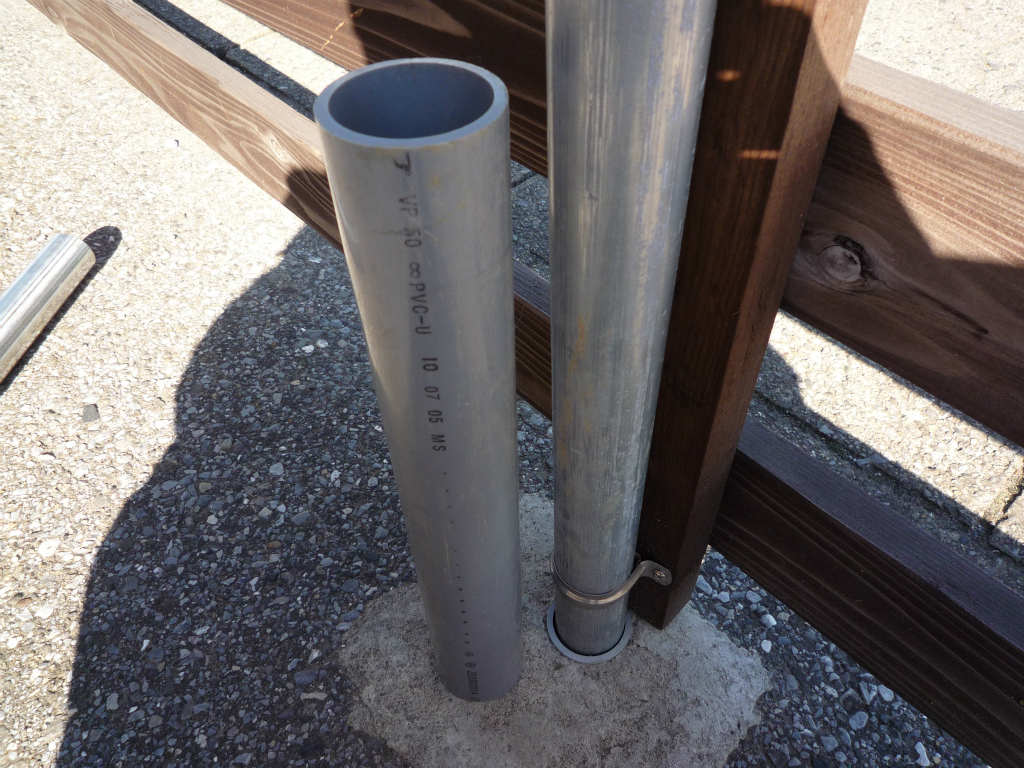 今回は前回の穴を使いますが、新たに足場単管パイプを 埋める場合は水道部材の塩ビ管vp50が足場管が丁度入る 大きさで活用できます。 埋める際は底にvp50用のキャップをつけ水抜き用の穴を ドリル等で空けます。穴は電柱掘り等で掘り、穴の深さを見て 底に砕石を少し入れ重めの棒で突っつき地固めしてから 足場管を刺したvp50を穴に入れます。 足場管が垂直になるように水平器をあてがいながら土を周りに 少し入れては棒で突っつき地固めの繰返しで、最後にコンクリを5cm程打つ。写真はvp50を使い足場管を挿しています。 |