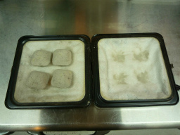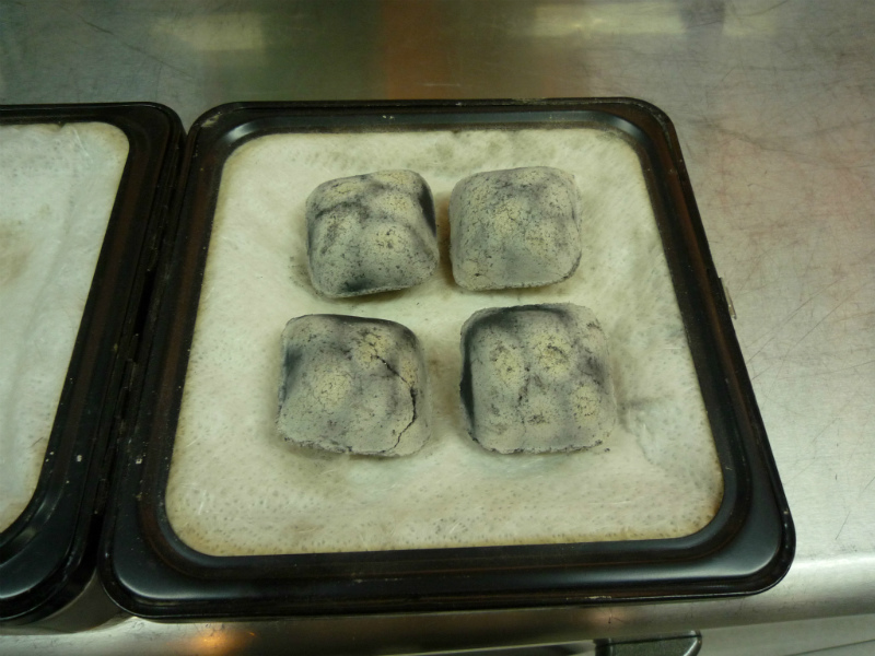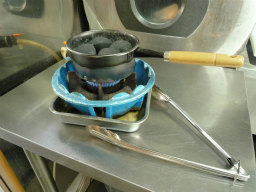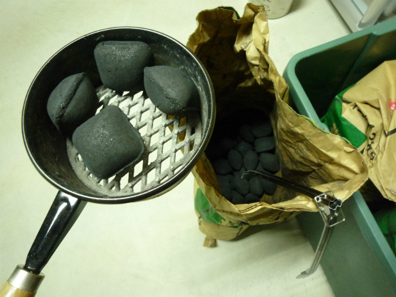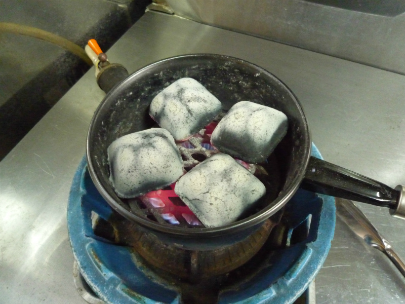 豆炭はトングでひっくり返しながら 全体が真っ白になるまで火を入れます。