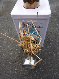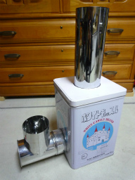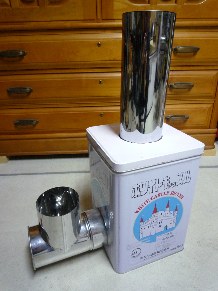 一斗缶に蓋をして煙突部材t字曲蓋付を取り付け完成。
