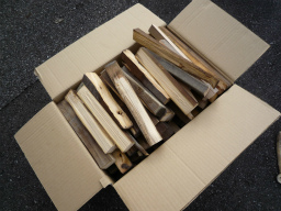 廃材を鉈で割って薪の準備。