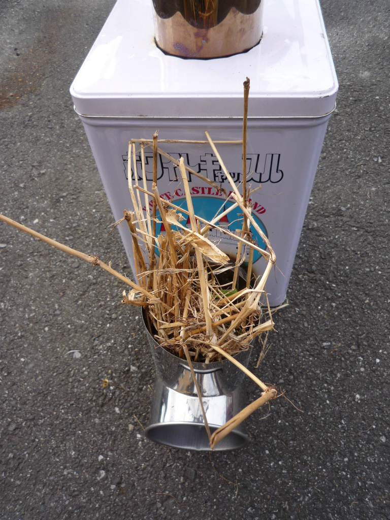 枯草を多めに燃焼部にいれて薪を入れる。