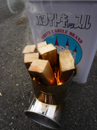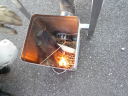 ターボライターで着火。 着火後、薪に火が付いたら 煙突部材T字曲の蓋をする。