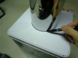 一斗缶に煙突をあてがい、穴を開ける為の下書きをする。