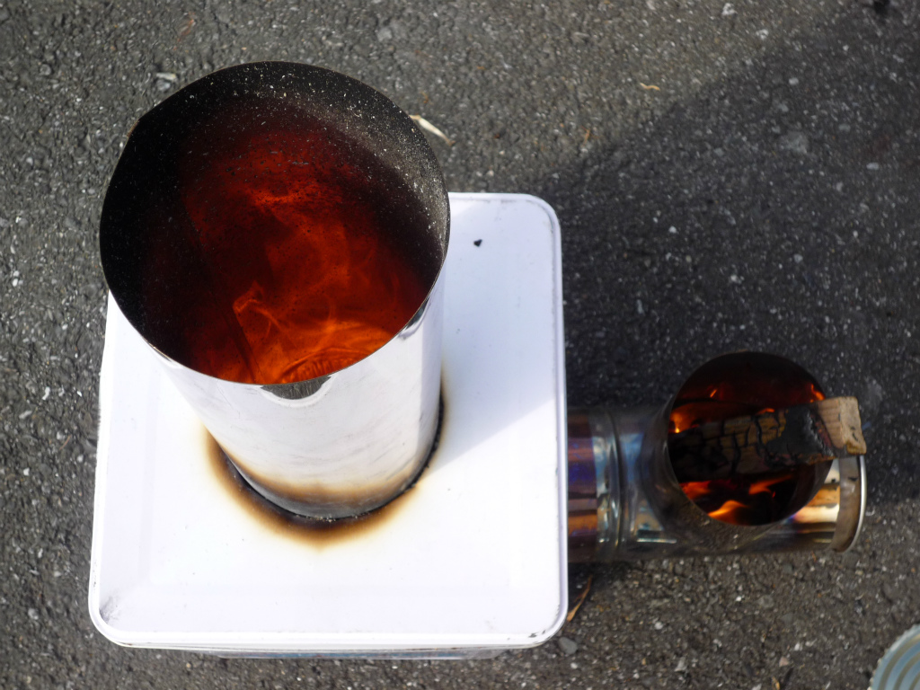 大きな炎が持続するようにロケットストーブを改良していく。