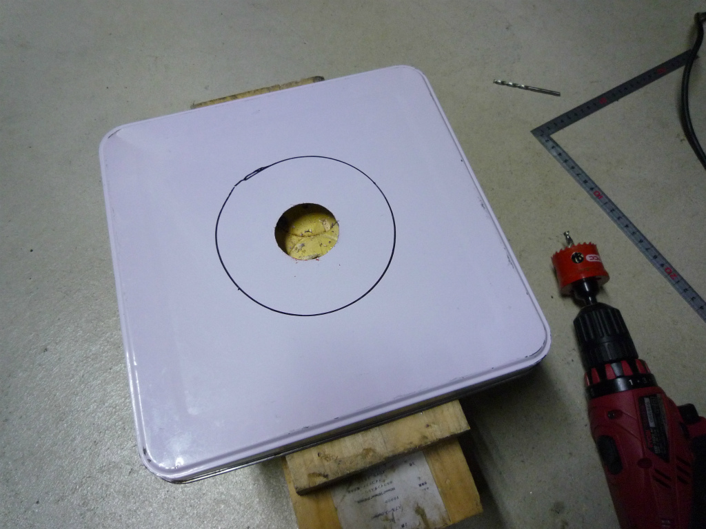 下書き線の中央にホルソー40mmで穴を開ける。