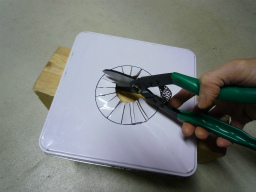 煙突用下書き線までブリキ鋏で切込みを入れていく。