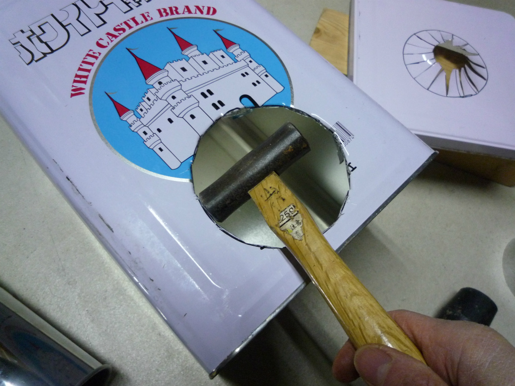 煙突が入るように玄能で穴を整える。