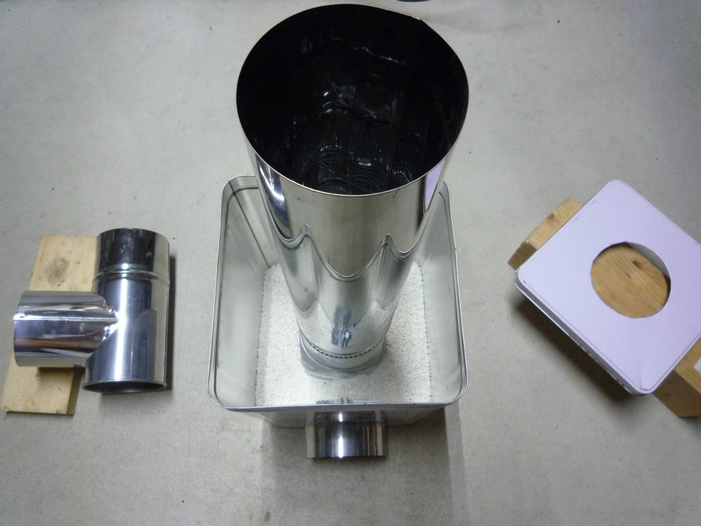 煙突部材エビ曲90度に煙突直筒を挿してから パーライトを入れる。