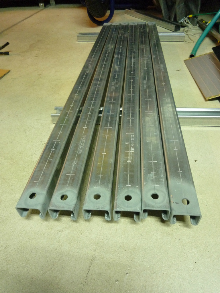 C型鋼は東西両面設置の枠として使用し、配線を通す為の穴をホルソーで空け、ジンクスプレーで塗装。 |