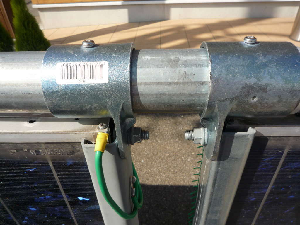 太陽光パネル設置の拡大写真2 左側がC型鋼で太陽光パネル両面を固定、右側がダクターチャンネルで一面のみ固定。 |