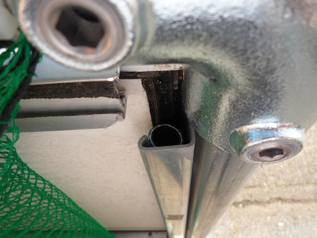 太陽光パネルのバタつきを抑える為に、水道用ホースをサイズに切ってダクターチャンネルの隙間に入れた。 |