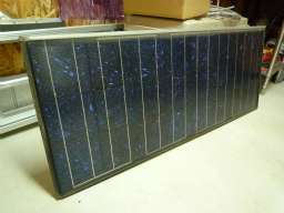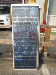 頂いた三菱製多結晶太陽光パネル。 電圧が18V、36V前後のパネルが多く、18Vであれば12Vバッテリー蓄電用として、36Vであれば24Vバッテリー蓄電用として使われるが、 このパネルは11vだったので48Vに蓄電する場合、6枚直列に使うか7枚直列に使うか悩んだ。 |