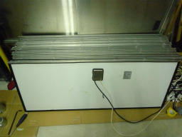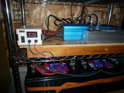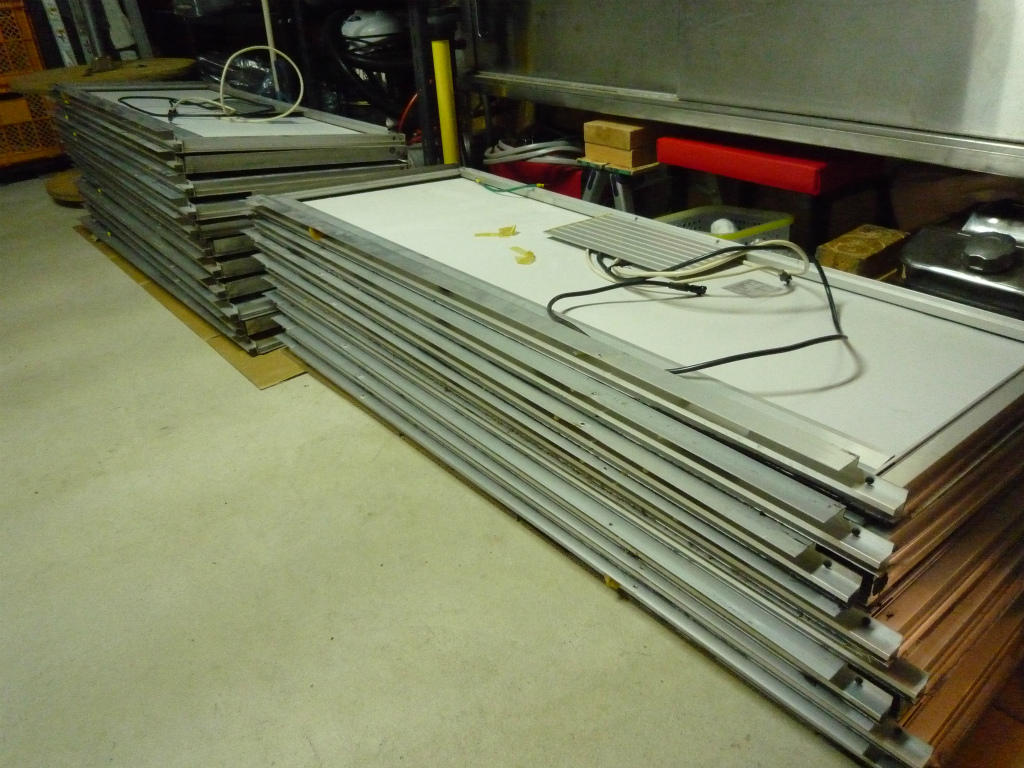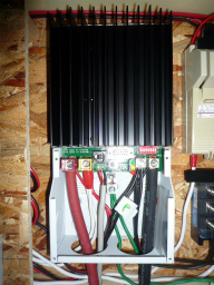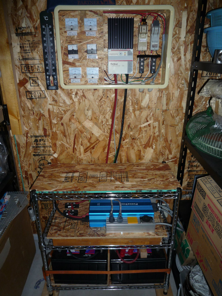 相当量無いと太陽光発電は天候に大きく左右される為厳しい。よって現在は冷凍庫を除く倉庫内すべての電力をまかい、停電時には冷凍庫へ電力を供給する事にした。 倉庫内はLED蛍光灯40Wタイプ3本、センサーライト3箇所、その他、900Wのコンプレッサー、グラインダー、卓上ボール盤、ドリル、インパクトレンチ等も使用出来る。 2年間使ってきたが今のところ不自由はない。 |