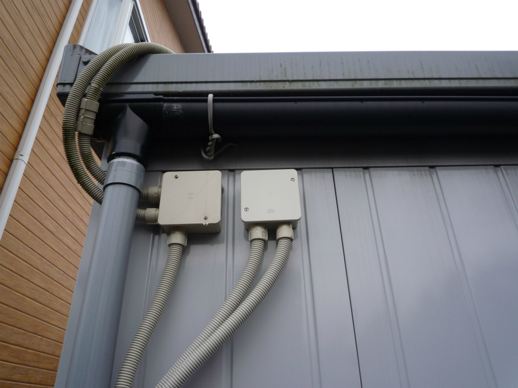 右側のアウトレットボックスが今回引き込んだ蓄電用ケーブル。 左側のアウトレットボックスは倉庫屋根の太陽光パネルからのケーブル、自作太陽光発電(余剰売電のページ)で使用。 |