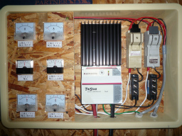 制御盤、枠は番重を使用しOSBボードをサイズに切って製作した。 チャージコントローラーはMorningstar社製 Tristar ts-60。MPPT制御では無くPWM制御の安いタイプ。 (MPPT制御の方はMPPTのロゴが本体に入っていて本体の厚みもある、形状が似ているので注意) 国内正規品は電菱が扱っている。 |