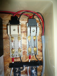 カバーナイフスイッチ20Aと15A。 東向き太陽光パネル12枚が右側20A。 西向き太陽光パネル6枚が左側15A。 中に20A、15Aのヒューズが入っており過電流になると溶断。 ナイフスイッチの一次側にそれぞれの開放電圧が測れるように電圧計を接続。 |