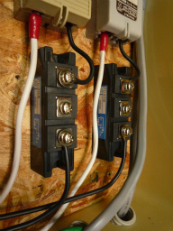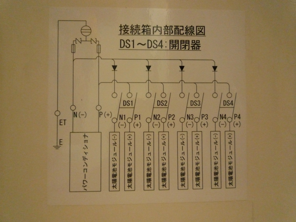 東向き西向きの太陽光パネルでは電圧に違いが出るので、逆流防止用にダイオードを接続。 逆流防止ダイオードは日本インター製 電力用ダイオードモジュールPC308。 パナソニックの売電用接続箱を参考にマイナス側に設置。 |