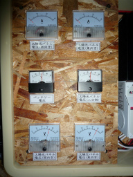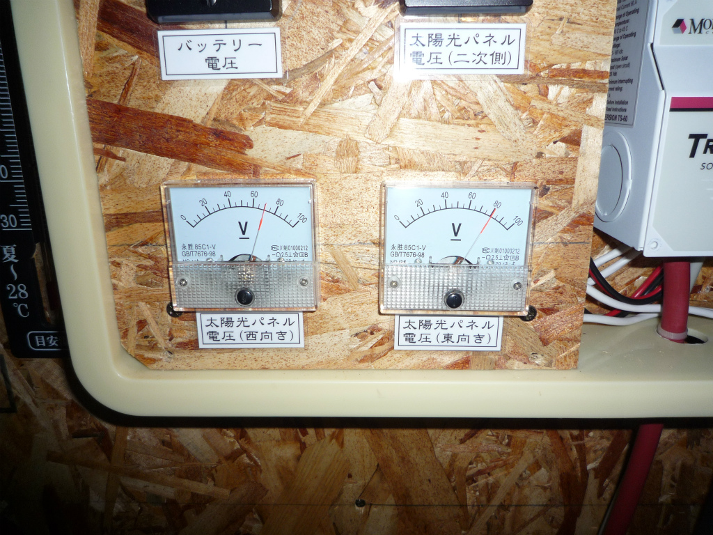 東西それぞれの太陽光パネルの電流計、バッテリーの電圧計、太陽光パネルの電圧計、東西それぞれの太陽光パネルの電圧計はナイフスイッチを切ると開放電圧が測れる。 |
