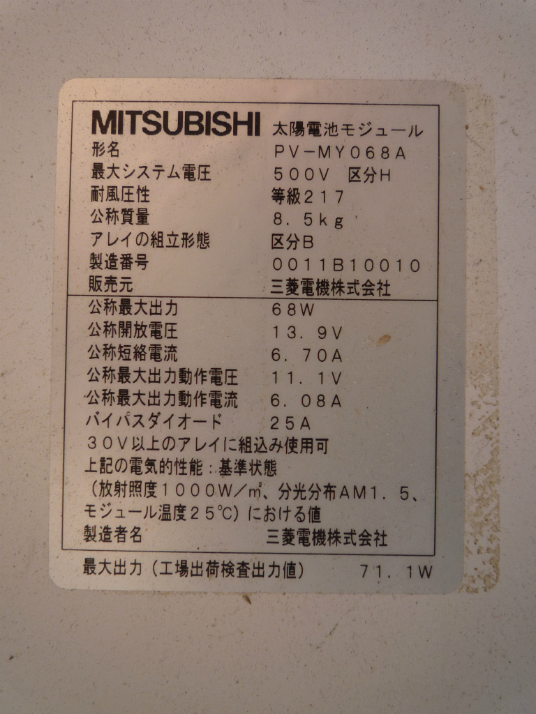 今回使用した三菱製の中古パネルはバイオマスエネルギーなど再生可能エネルギー関連のお仕事をされている、都内にお住いのM様から譲って頂きました。 当自作太陽光発電のページをご覧になって下さり、有効活用して頂きたいとのありがたいお話を頂きました。 M様この度は誠にありがとうございました。 |