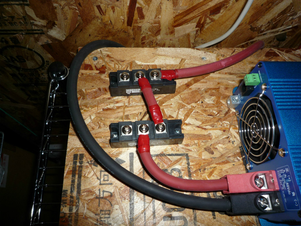 ケーブルは自動車用の100aブースターケーブルを使用。バッテリー、インバーター間の+側に日本インター製pd1008(100a)を2個直列で取り付け(仮設置状態)。これは上記のコントローラーの設定を15.5v