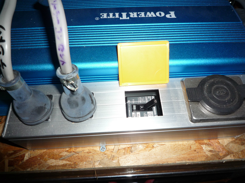 インバーターのコンセントから倉庫内の電力をまかなっているので、漏電ブレーカーを設置。 (特殊なタイプだが、ヤフオクにて入手) |
