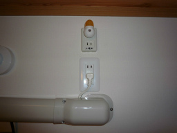 上のコンセントが非常用コンセント。光センサー付きのLED常夜灯0.5Wをコンセントに差してあるので夜中の停電時でも真っ暗にはならない。 |