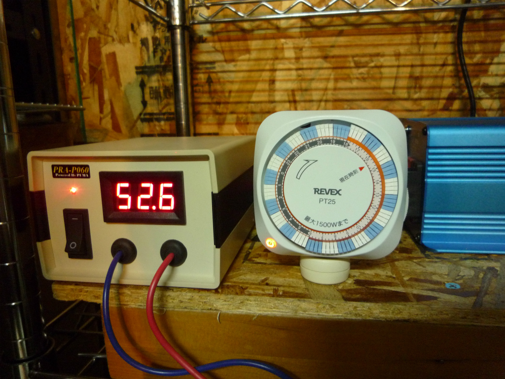 正弦波インバーターにつないで電源を供給しているが、夜間は無駄な電力消費になるので、タイマーを取り付け太陽の出ている時間のみ動作するようにした。 |